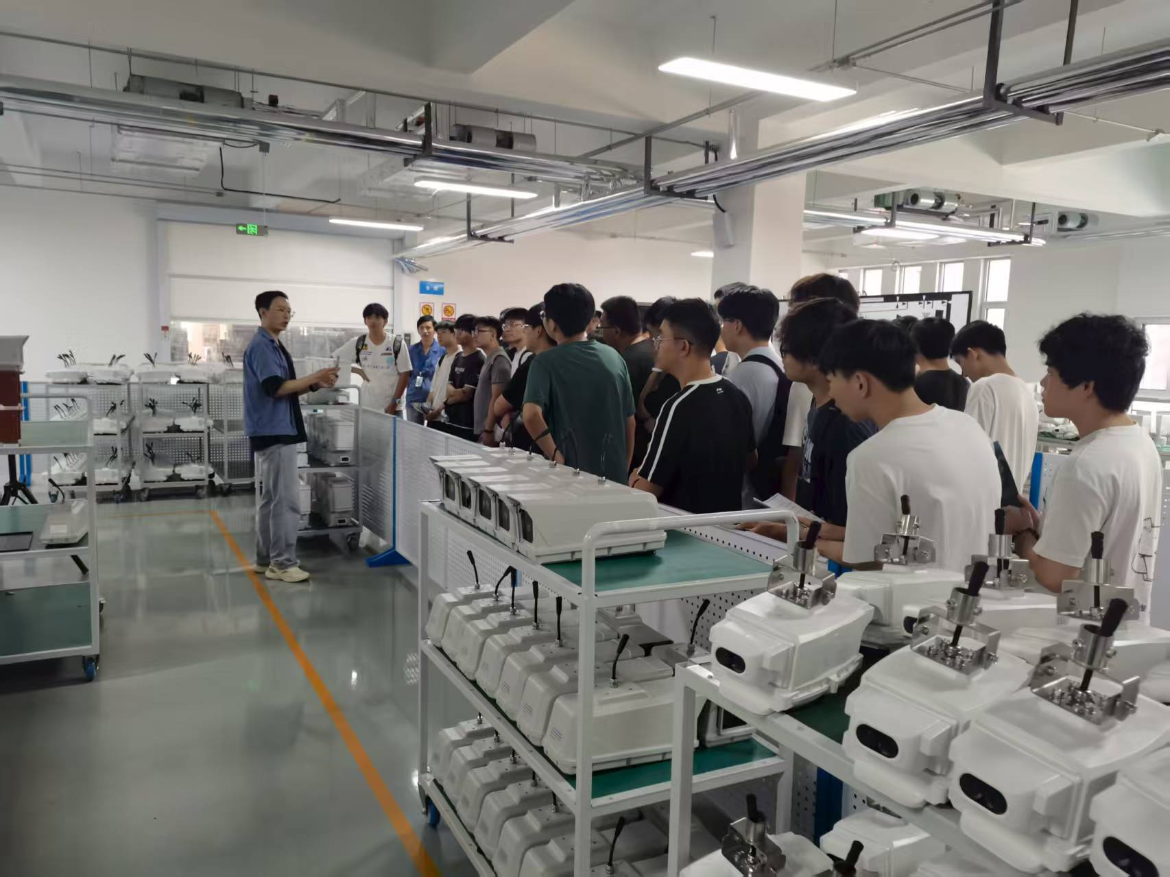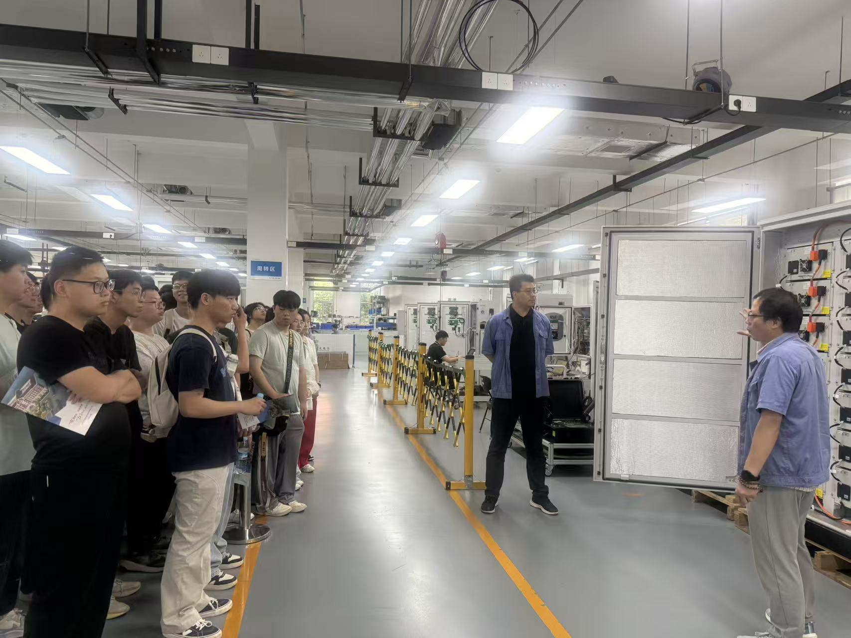 在生产制造中心车间,同学们近距离参观了充电桩、储能设备、录波器、输电线路故障定位系统、视频监拍装置等系列产品的完整生产流程,重点学习了产品加工标准、工序质量控制及试验检测要点,并就技术应用、生产实操等问题与现场工作人员展开互动交流,进一步强化了理论知识与产业实践的认知衔接。